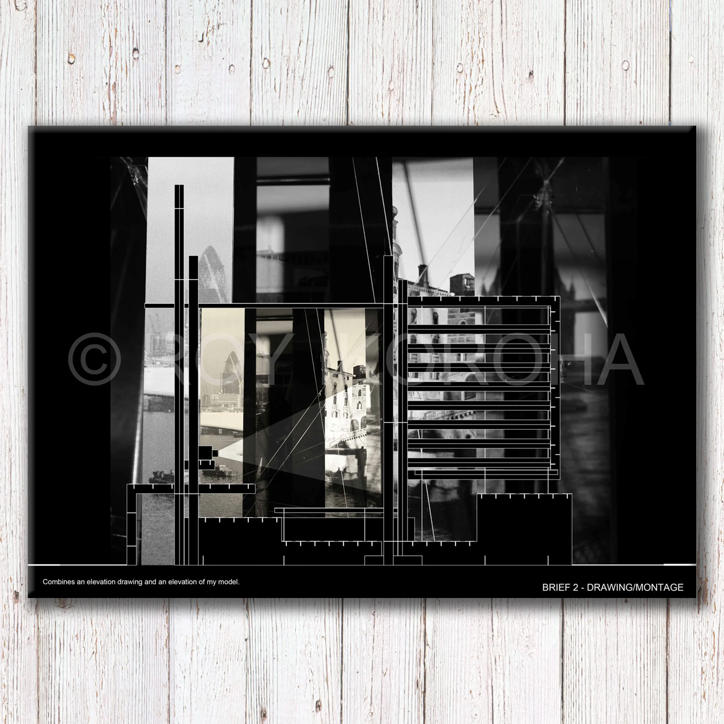 Furthermore, a computer montage needed to be generated which combined an abstract model (from a supplementary design module) and an elevation drawing of my created pavilion. The main purpose of this was to emphasise the cinematic space inside the pavilion.