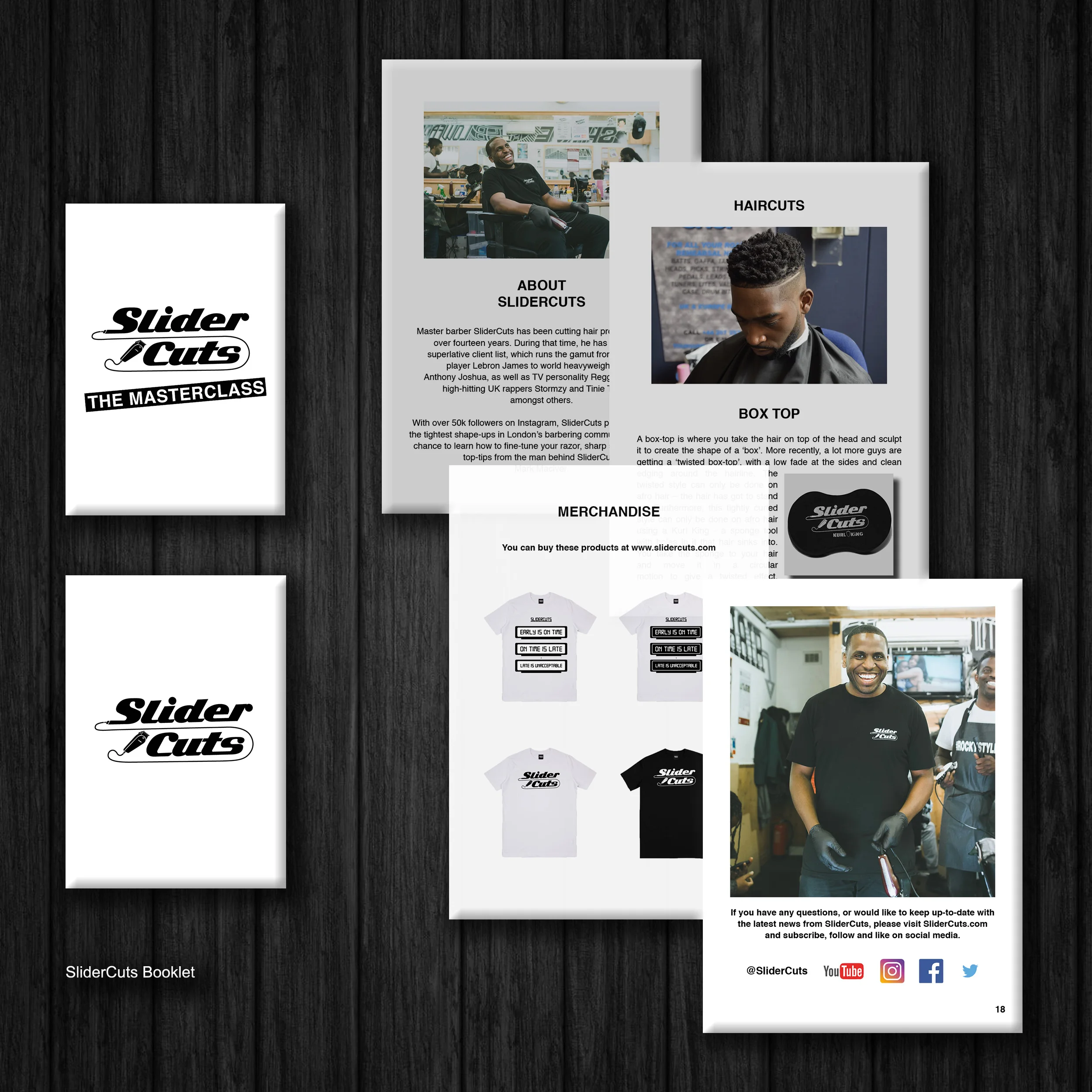 SliderCuts often cut hair for the likes of celebs such as Anthony Joshua and Tinie Tempah. Requested was new t-shirt designs based on the copy: "Early is on time; on time is late; and late is unacceptable." These t-shirts were to compliment his existing range of tees. In addition, a twenty-page A5 booklet needed to be designed to supplement a barber business masterclass SliderCuts was running (25/09/17).